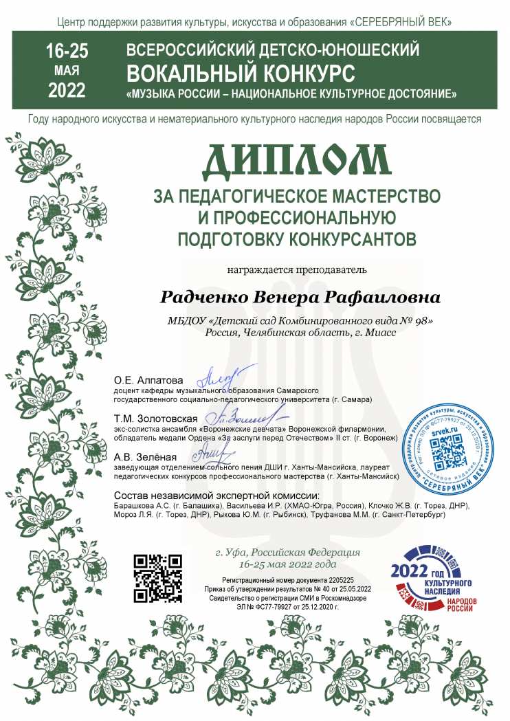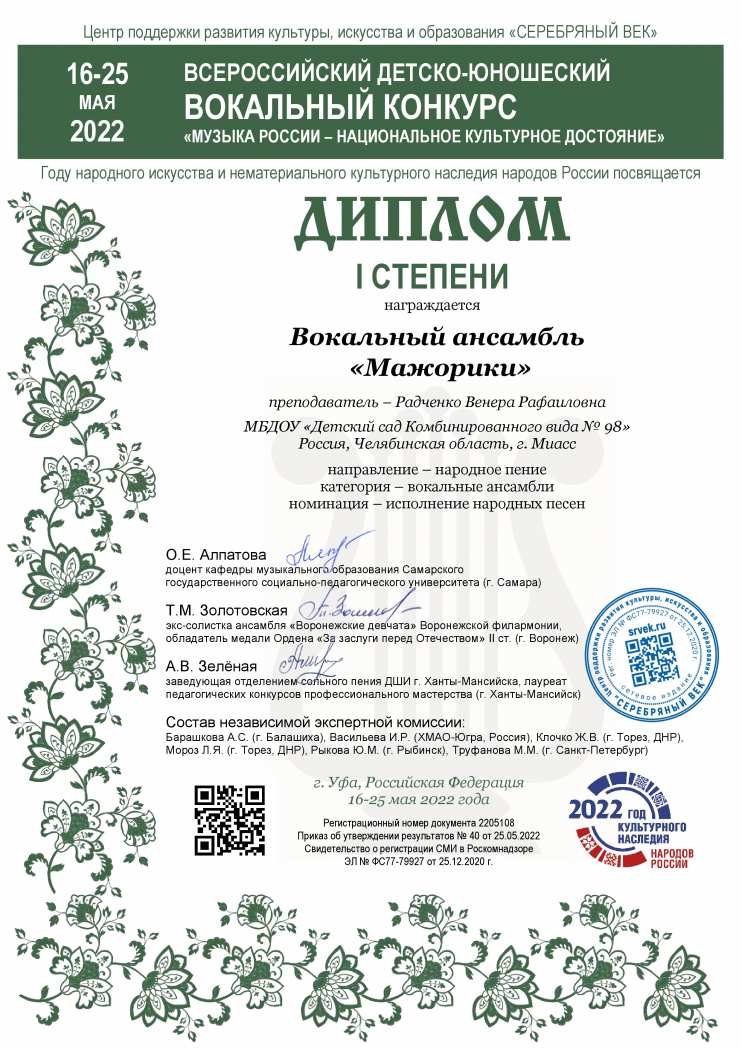 Мы приняли участие во Всероссийском детско-юношеском вокальном конкурсе "Музыка России - национальное культурное достояние", который был посвящен 2022 году - Году народного искусства и нематериального культурного наследия народов России. Конкурс проходил в г. Уфа с 16 по 25 мая 2022 года.