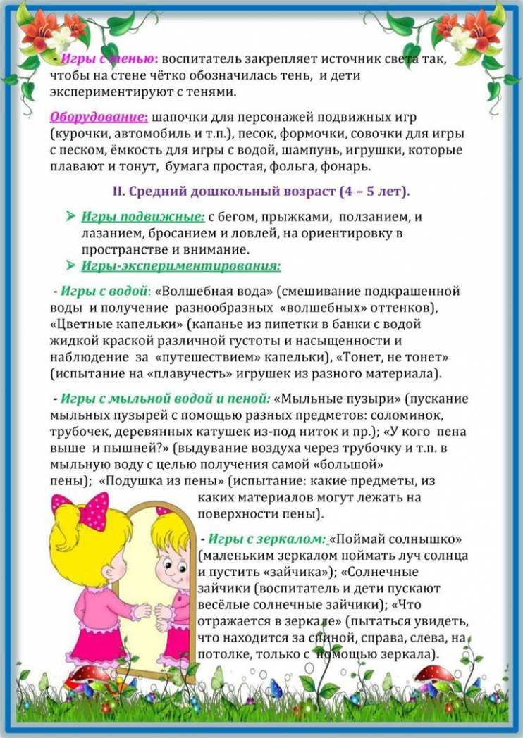 С детьми средней группы: проводятся игры более разнообразные по содержанию, чем с малышами. У детей этого возраста в результате воспитательной работы расширяют представления об окружающем. Поэтому в игры можно включать не только те образы и явления, которые дети непосредственно видят, но и такие, с которыми детей знакомят при помощи рассказов, картинок. В средней группе, как и в младшей, проводятся игры, в которых нет образа, но в средней группе в них носят элемент соревнования, сначала индивидуального, а затем и коллективного. В средней группе также даются игры, сопровождающиеся текстом, причем исполнение текста может быть хоровым. Текст дает ритм движению, помогает развитию речи у детей; окончание текста служит сигналом к прекращению действий или к началу новых движений. Дети старшего возраста более самостоятельны и активны, чем малыши. Их движения становятся более точными, поэтому можно проводить игры и забавы с более сложными двигательными заданиями.