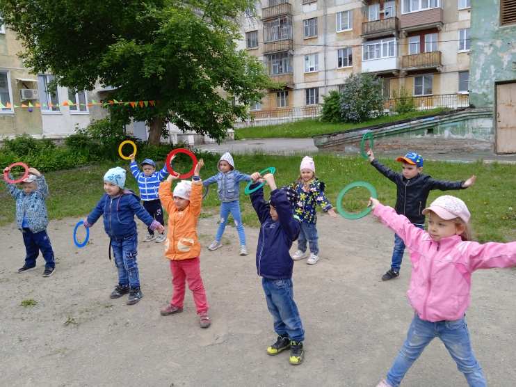 В летний оздоровительный период в нашем детском саду утренняя гимнастика проходит на свежем воздухе, в соответствии с температурным режимом и санитарным нормам и требованиям.