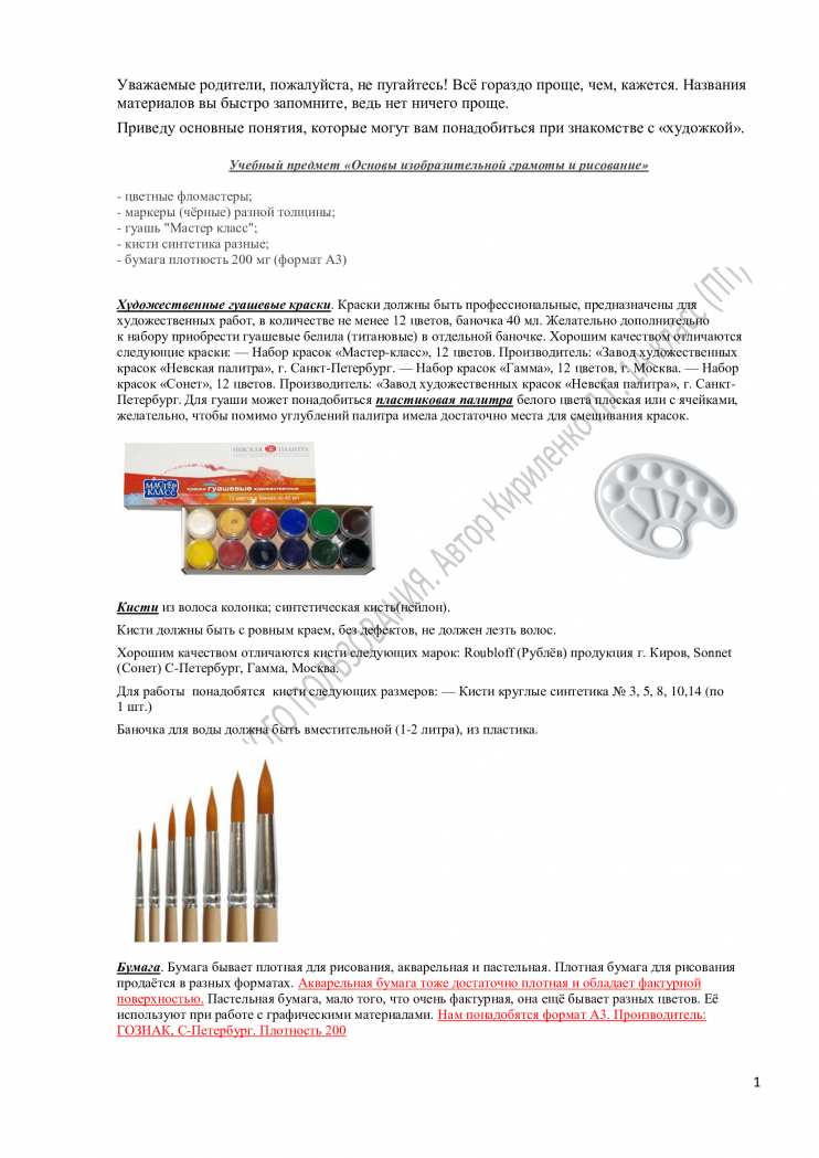 6. Краски гуашевые не менее 12 цветов производства Санкт-Петербург или «Гамма». Отдельно к набору необходима банка белил,