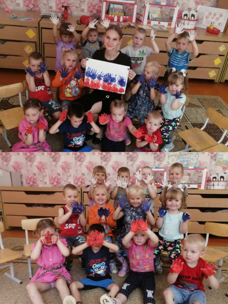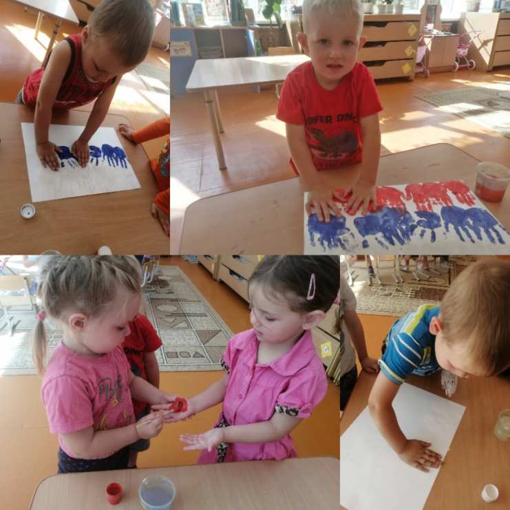 Сначала дети познакомились с нашим флагом. Потом нарисовали его ладошками.