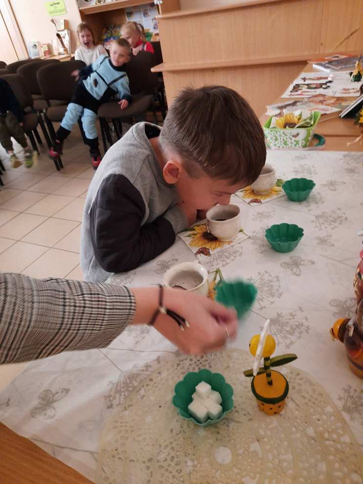 Библиотекарь встретила нас и сначала познакомила детей с работой библиотеки. Рассказала о правилах поведения, как и где стоят книжки, что у каждой книги есть документ-паспорт, по которому можно узнать всё о книге. После знакомства началась интересная беседа про чай: дети много узнали про историю чая, как в давние времена "гоняли" чай. Что самым главным на столе был самовар, в котором заваривали разные травы. С чем любили пить чай. Потом было много загадок, игр, стихотворений о чае. Дети по запаху определяли, с чем чай: мята, малина, лимон и т.д., кто быстрее оденет сушки на ленту, находили 10 отличий на картинках, где девочки пили чай. Дети были в восторге.