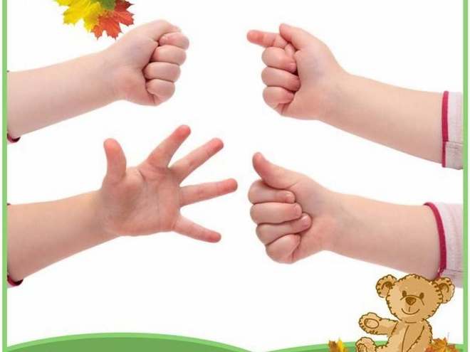 - Каждому упражнению соответствует свой рисунок для создания зрительного образа. Сначала покажите ребёнку цветной рисунок и объясните, как должно выполняться упражнение, затем вы показываете картинку, называете упражнение, а малыш выполняет, какое положение кистей рук или пальцев он должен воспроизвести.
