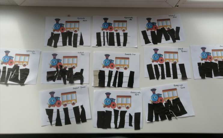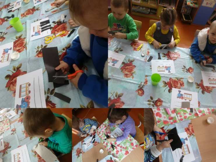 На занятии по аппликации «Железная дорога» дети впервые познакомились с ножницами. Результат превзошел ожидания. Очень красивые и достаточно ровные и аккуратные получились работы.