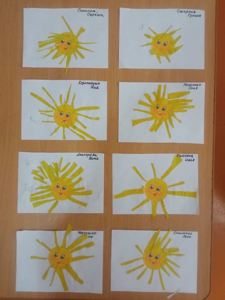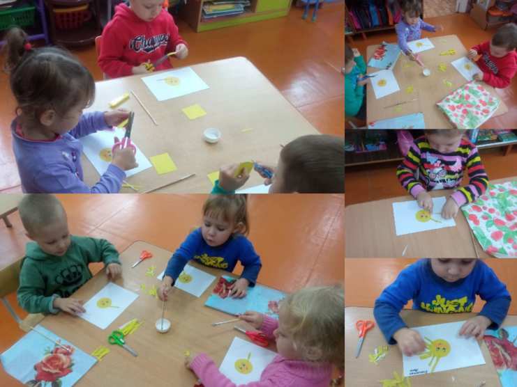 А на занятии по аппликации дети закрепили умение пользоваться ножницами, вырезая лучики для солнышка.
