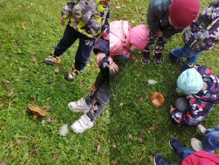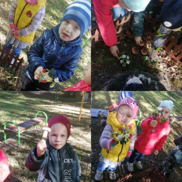 Во время прогулки с детьми вновь была совершена прогулка по экологической тропе, где дети разглядели и потрогали землянику и грибочки (искусственные), а потом даже нашли настоящие грибы!