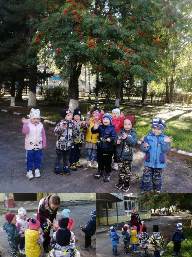 И конечно мы никак не могли пройти мимо рябины. Дети посмотрели листочки, ягодки, кто-то даже незаметно попробовал рябину на вкус, обнаружив, что она горькая.