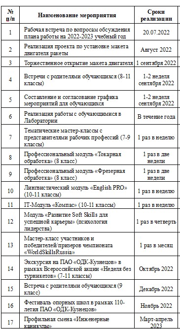 План мероприятий Лаборатории ПАО «ОДК-Кузнецов» в МБОУ Школа № 26 на 2022-2023 учебный год