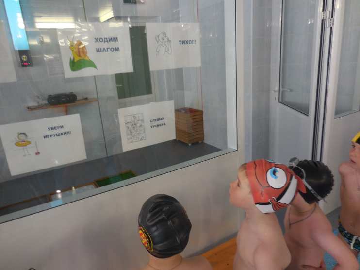 Инструктор: Сели на паровоз и поехали! (Дети строятся в паровоз и отправляются) И впереди у нас первая остановка - станция «Правила поведения в бассейне». Итак, повторим правила безопасного поведения на занятиях по плаванию.