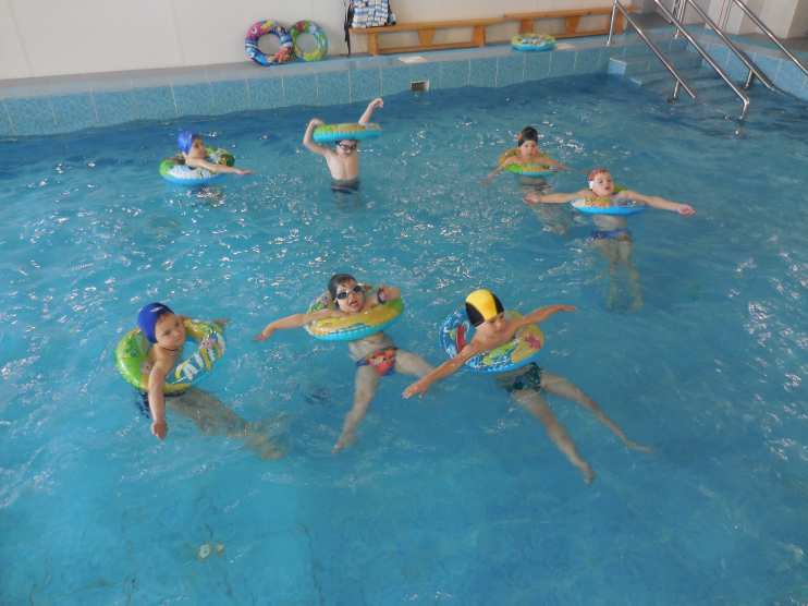 Дети строятся у бортика с кругами. Плавание с кругом на груди и спине.
