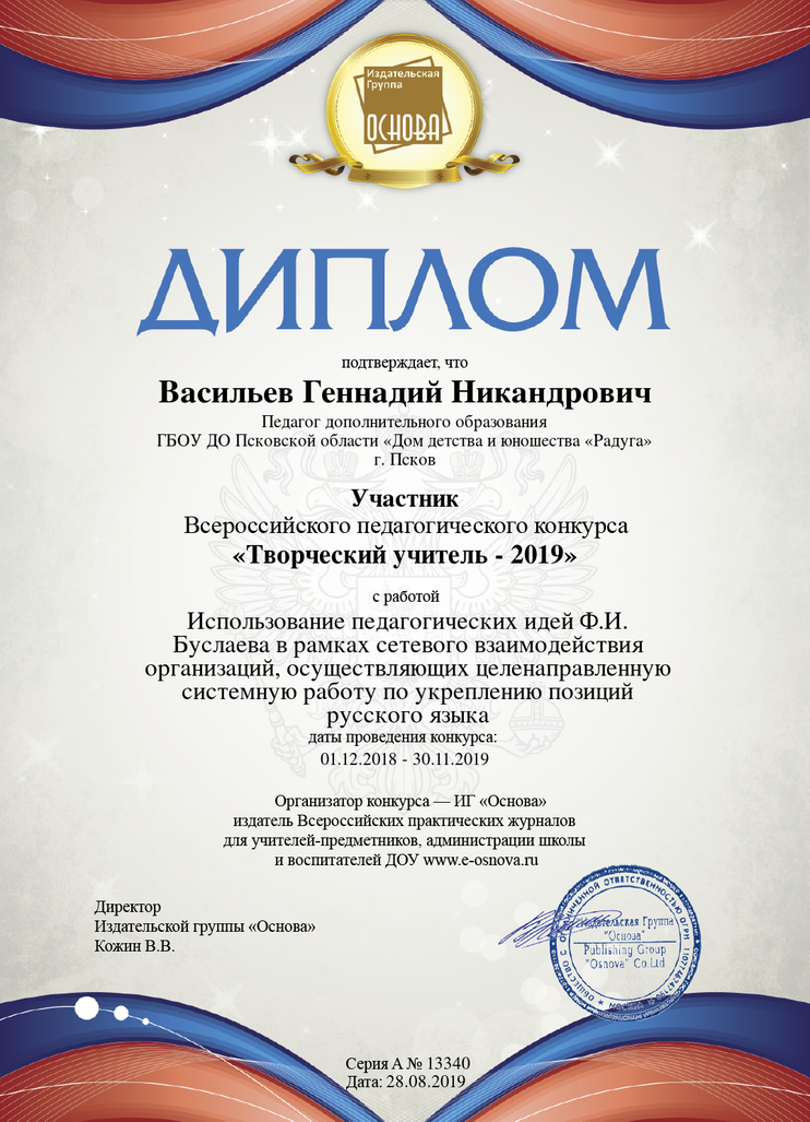 Публикация "Использование педагогических идей Ф.И. Буслаева в рамках сетевого взаимодействия организаций, осуществляющих целенаправленную системную работу по укреплению позиций русского языка" опубликована в журнале "Современный урок" в рамках Всероссийского конкурса на лучшую публикацию - «Творческий учитель - 2019» (Организаторы: Всероссийский сетевой педагогический журнал «Современный урок» и Издательская группа «Основа»).