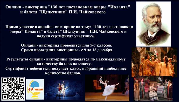 В МАОУ гимназии №49 была проведена онлайн-викторина на тему: "130 лет постановкам оперы "Иоланта" и балета "Щелкунчик" П.И. Чайковского", в которой приняли участие учащиеся 5, 6 и 7 классов. По итогам викторины призерами стали: