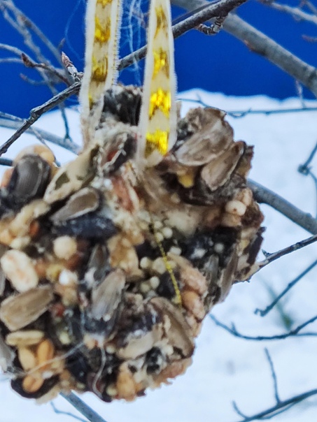 Съедобная кормушка для птиц - это кормушка, которая изготовлена из природных материалов своими руками. По виду напоминает печенье, через которое продета верёвочка для фиксации на ветках деревьев.