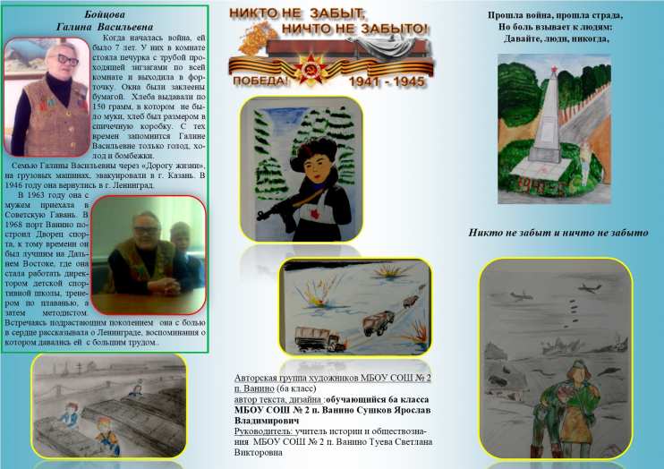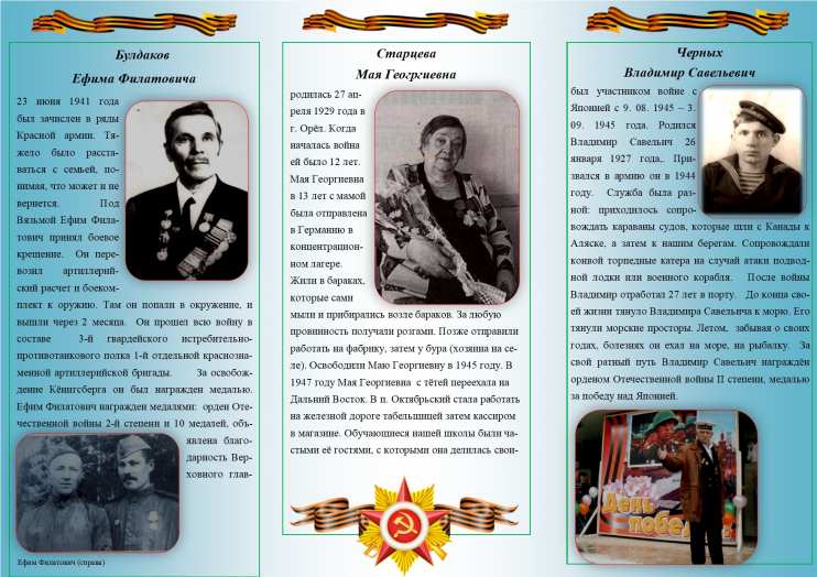Буклет выполнен в рамках патриотического марафона к Дню Победы. На буклете краткий боевой путь наших земляков: Бойцовой Галины Васильевны, Булдакова Ефима Филатовича, Старцевой Маи Георгиевны, Черных Владимира Савельича.