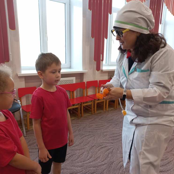 Перед соревнованиями доктор Айболит послушал детей играючи, допустил их до соревнований и остался посмотреть на юных спортсменов.