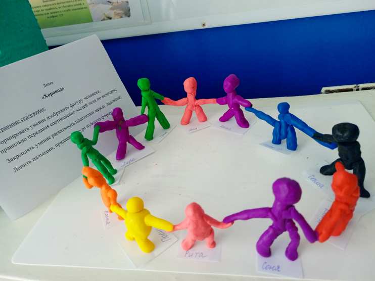 На занятии по лепке дети лепили фигуры человека, из которых потом образовался весёлый, разноцветный хоровод.