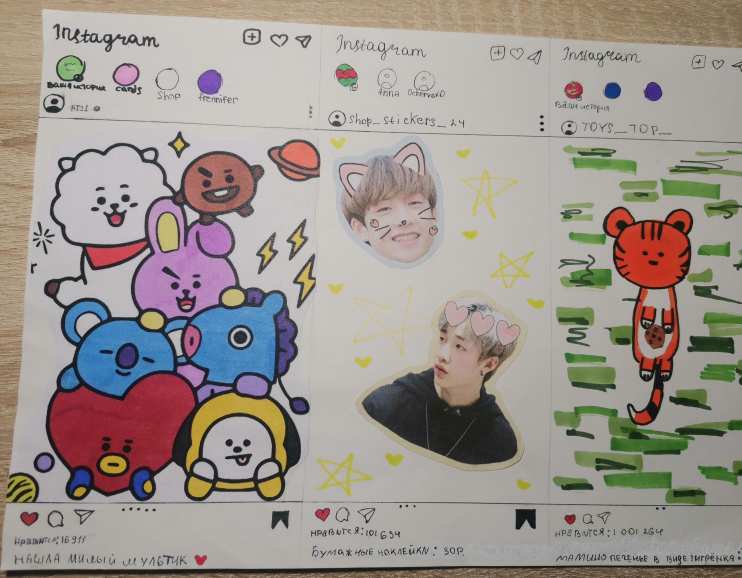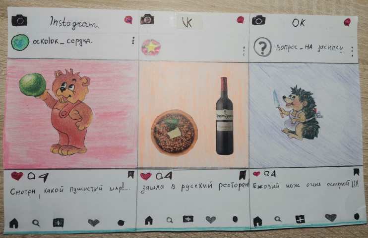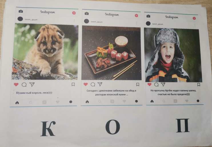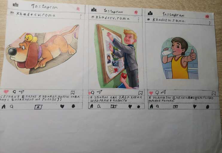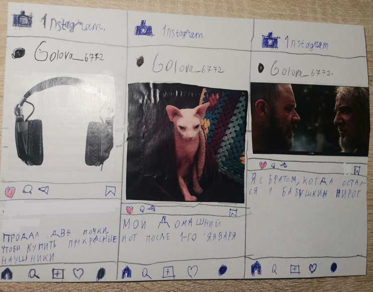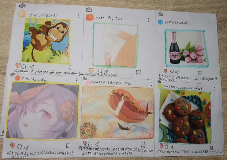 Ребята должны были представить на листе бумаги три (или 6) макетов страниц любой из своих социальных сетей. Главной задачей было правильно подписать пост. В подписи первого поста обязательно должно было присутствовать качественное прилагательное, во втором посте - относительное, в третьем - притяжательное. Задача усложнялась тем, что нужно было ещё и подобрать картинку, подходящую данной подписи. Картинки ребята брали из рекламных журналов, старых и не нужных, которые не жалко было изрезать.