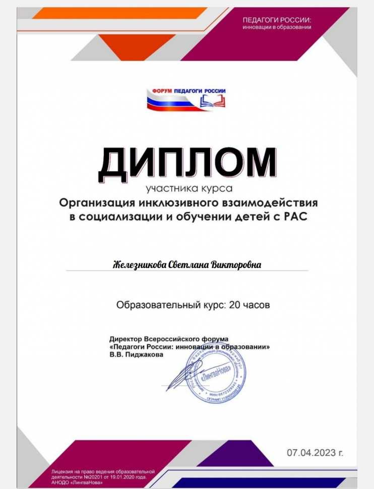 С 1 по 7 апреля приняла участие в курсе: "Организация инклюзивного взаимодействия в социализации и обучении детей с РАС".