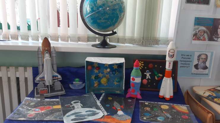 А также ребята вместе с родителями подготовили рисунки и поделки на космическую тематику.