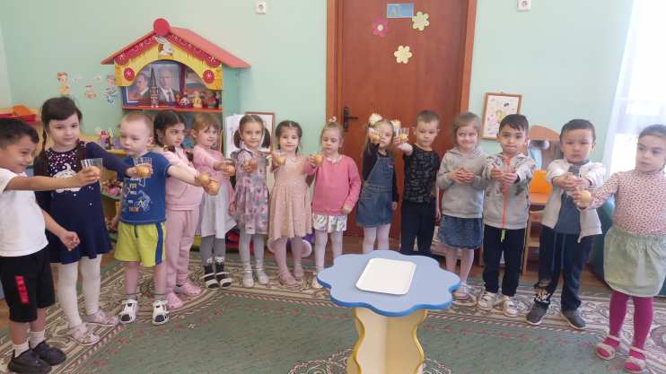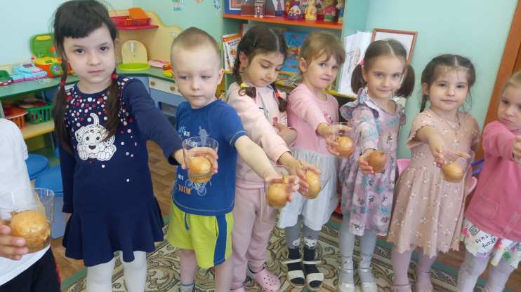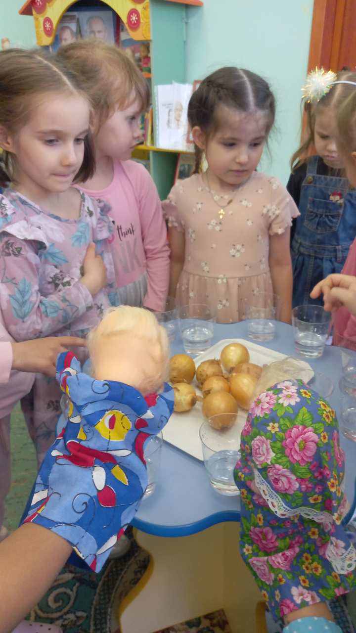 Под салфеткой лежат головки репчатого лука на каждого ребёнка.