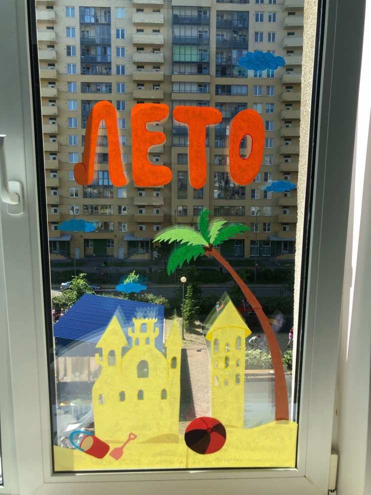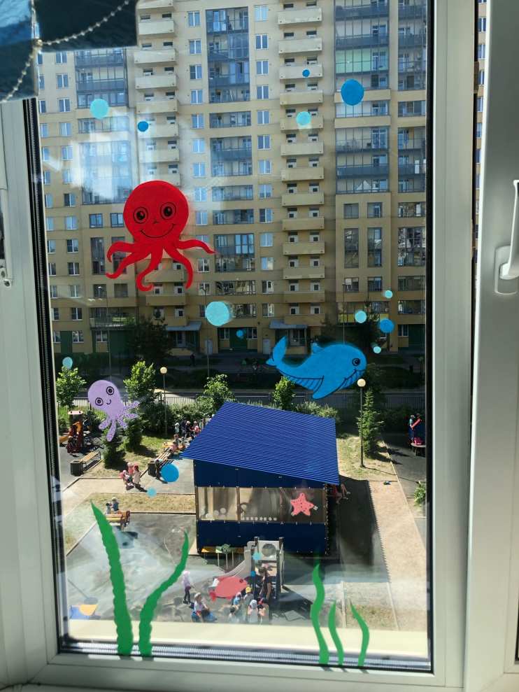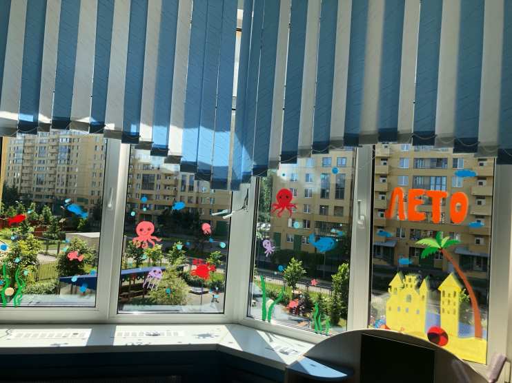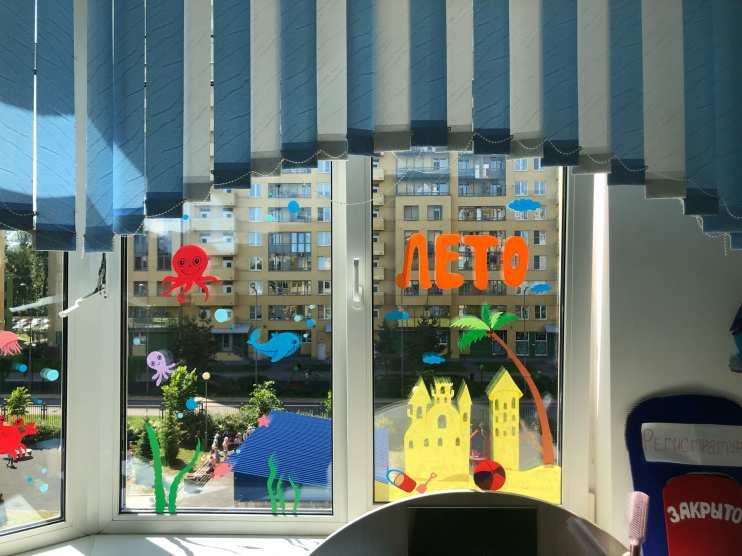 Для летнего оформления окон в старшей группе «Морские обитатели» было выбрано декорирование мультяшными морскими жителями, что соответствует и тематике по названию, и дизайну интерьера самой группы.