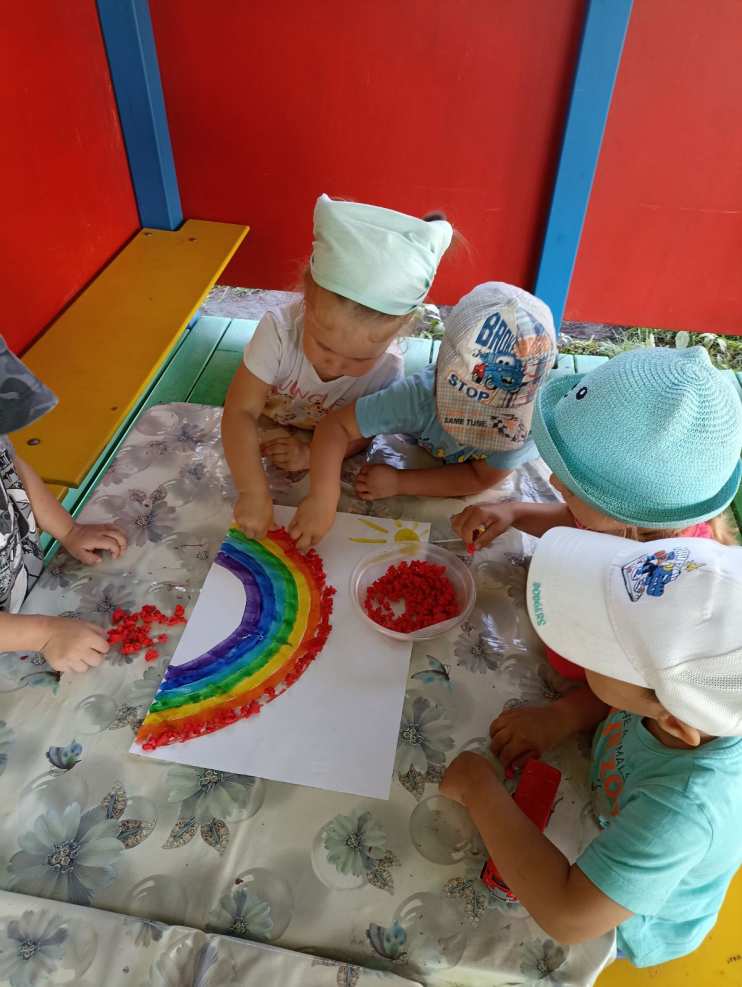 Утром, собираясь в группе, детки, видя педагога, скатывающего шарики, охотно присоединялись. До завтрака успели сообща, а на прогулке изготовили коллективную аппликацию.