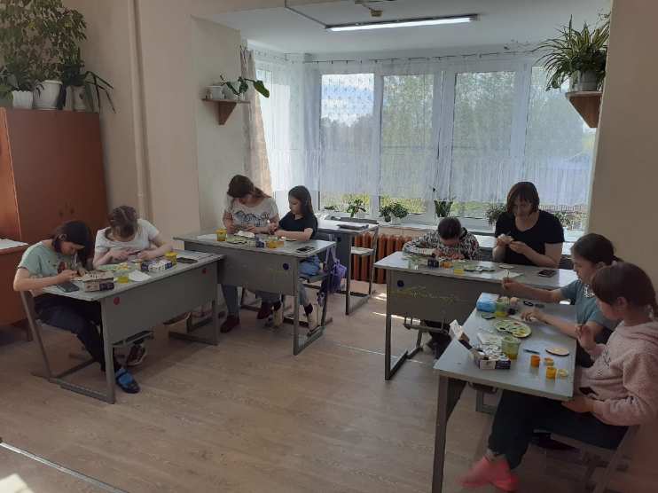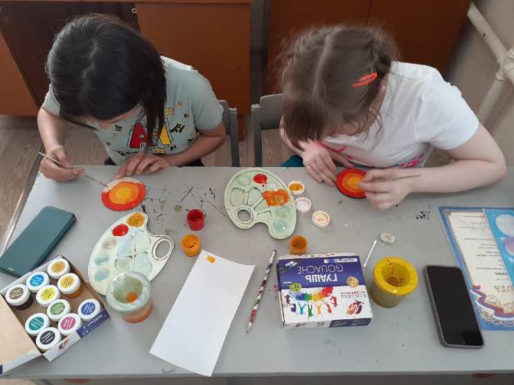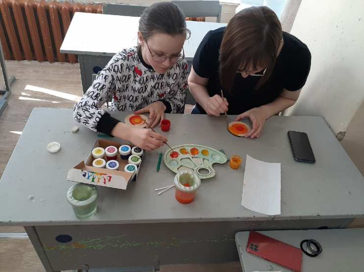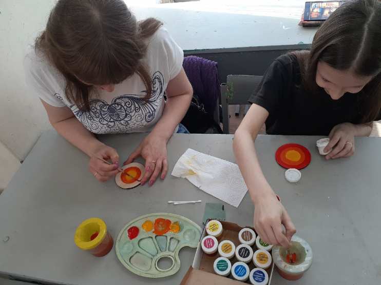 Затем дети предложили родителям расписать деревянные заготовки — «Солнышки». Было приятно выполнять работу под чутким руководством детей, которые подробно рассказывали и показывали каждый этап работы. Взрослые признали, что расписывать — это дело хлопотное, сложное, кропотливое. Но все получилось на «отлично». Все большие молодцы!