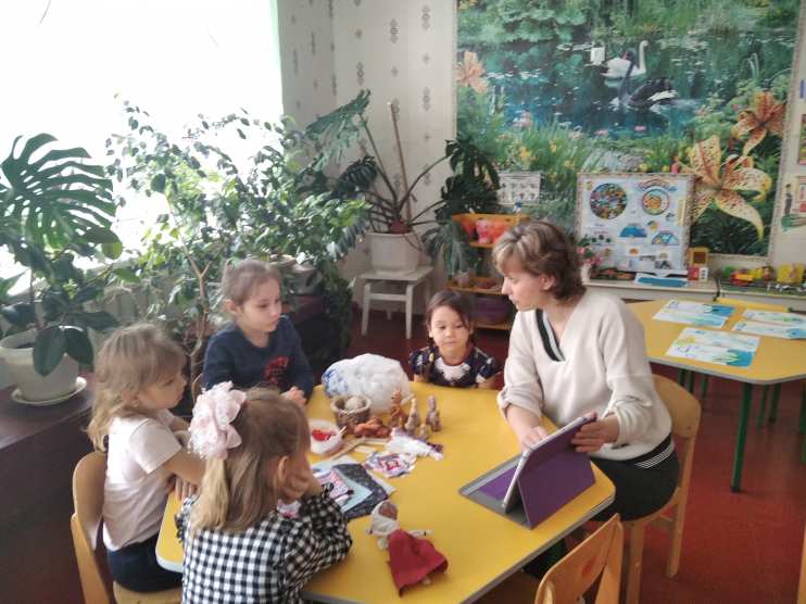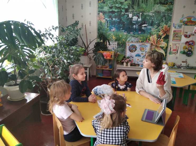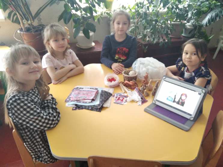 Психолог: Ребята, я рада вас сегодня видеть. У нас в гостях Берегиня (давайте поздороваемся с ней), и у нас будет необычное занятие: мы будем с вами делать своими руками тряпичную куклу. Но сначала я расскажу вам, как она появилась на Руси, и нашей гостье тоже будет интересно.
