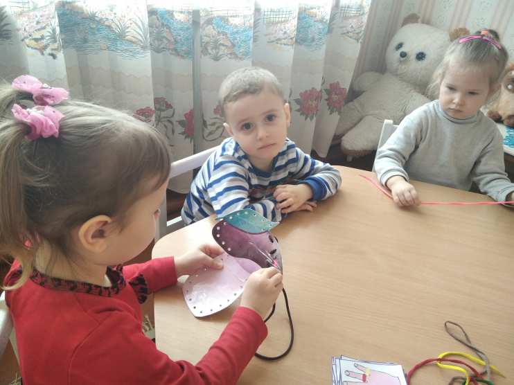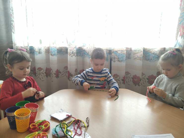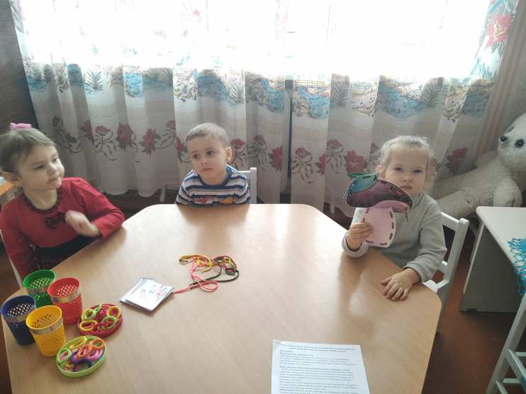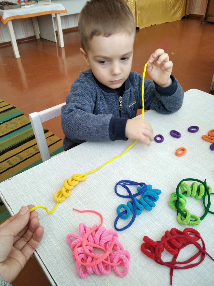 Оборудование: цветные шнурки, карточка для шнурования, цветные стаканы, мисочка с цветными резинками, карточки с изображением схем.