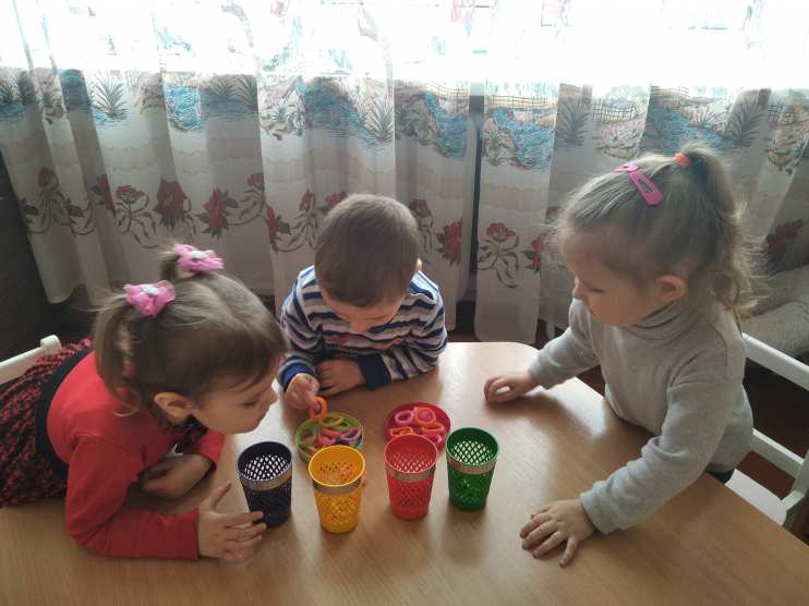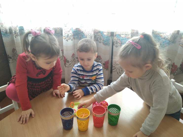Описание: Ребёнку предлагается рассортировать резиночки по цвету - раскладывая по стаканам в соответствии с цветом.
