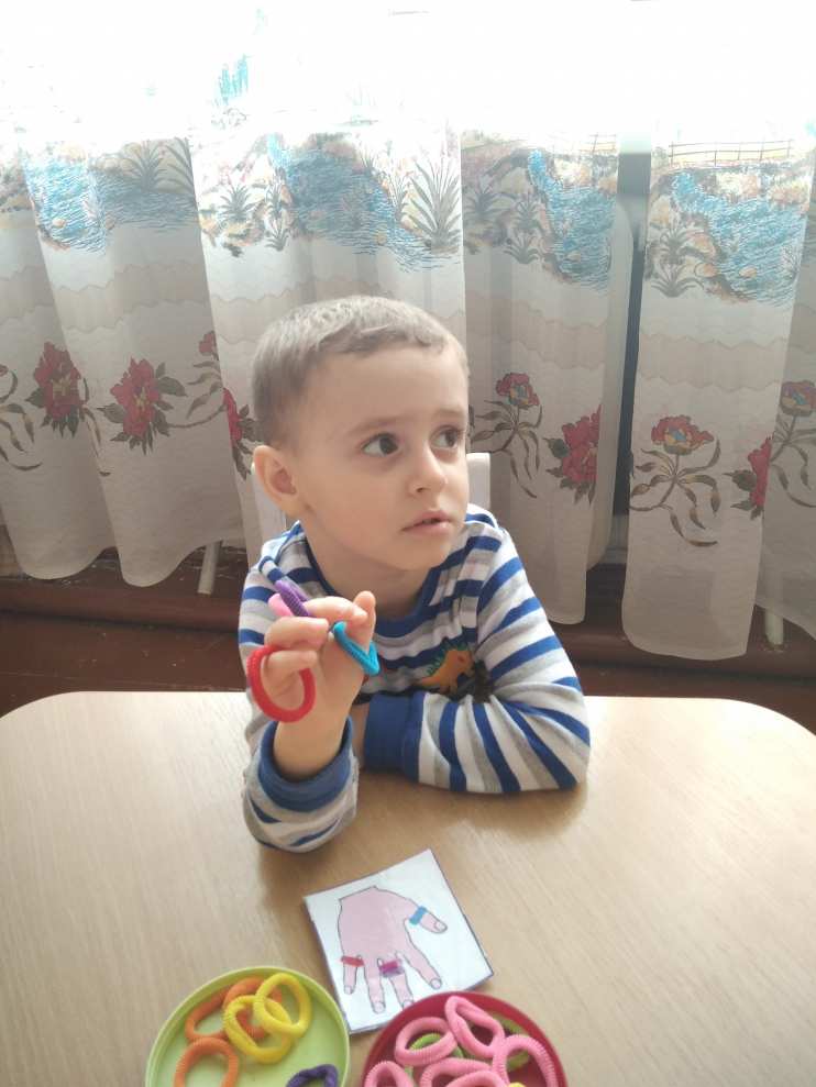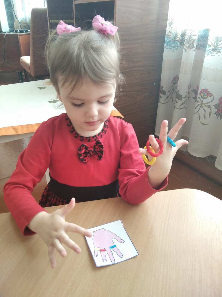 Цель: Развивать тонкие движения пальцев рук, внимание, пространственное ориентирование, способствовать развитию речи, закреплять знания детей о названиях пальцев, выполнять словесную инструкцию.