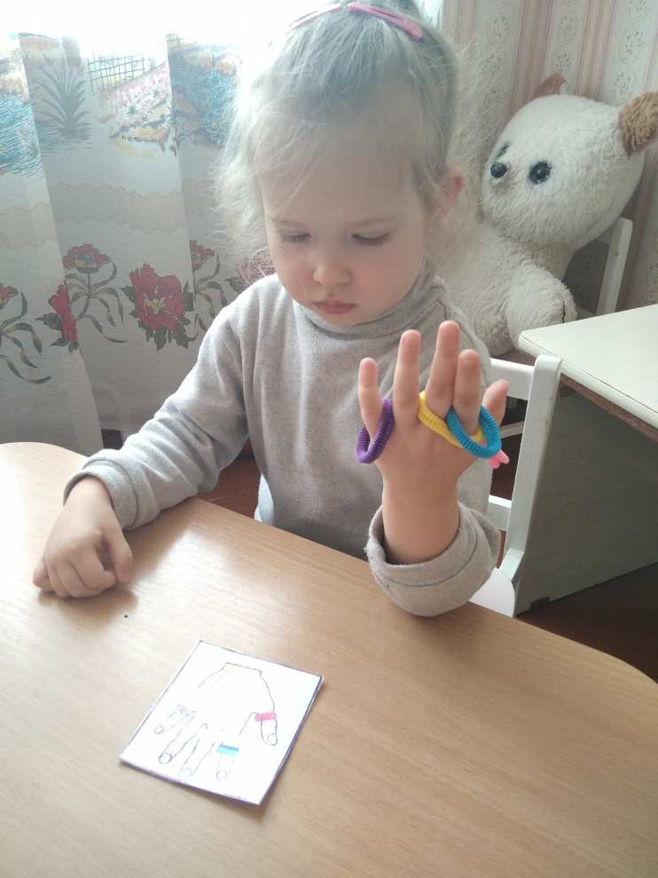 Описание: Детям предлагается надевать «резиночки» на пальцы в соответствии с определенной схемой. Каждый ребёнок выбирает карточку с заданием из общей колоды карточек, и по команде начинает надевать на свою руку (левую или правую, зависит от задания на схеме) цветные «резиночки» так, как это показано на схеме. К примеру, на мизинец - красную, потом жёлтую, на средний палец синюю, а потом на средний и указательный фиолетовую. Кто первый выполнил задание - хлопает в ладоши или говорит: «Стоп игра!».
