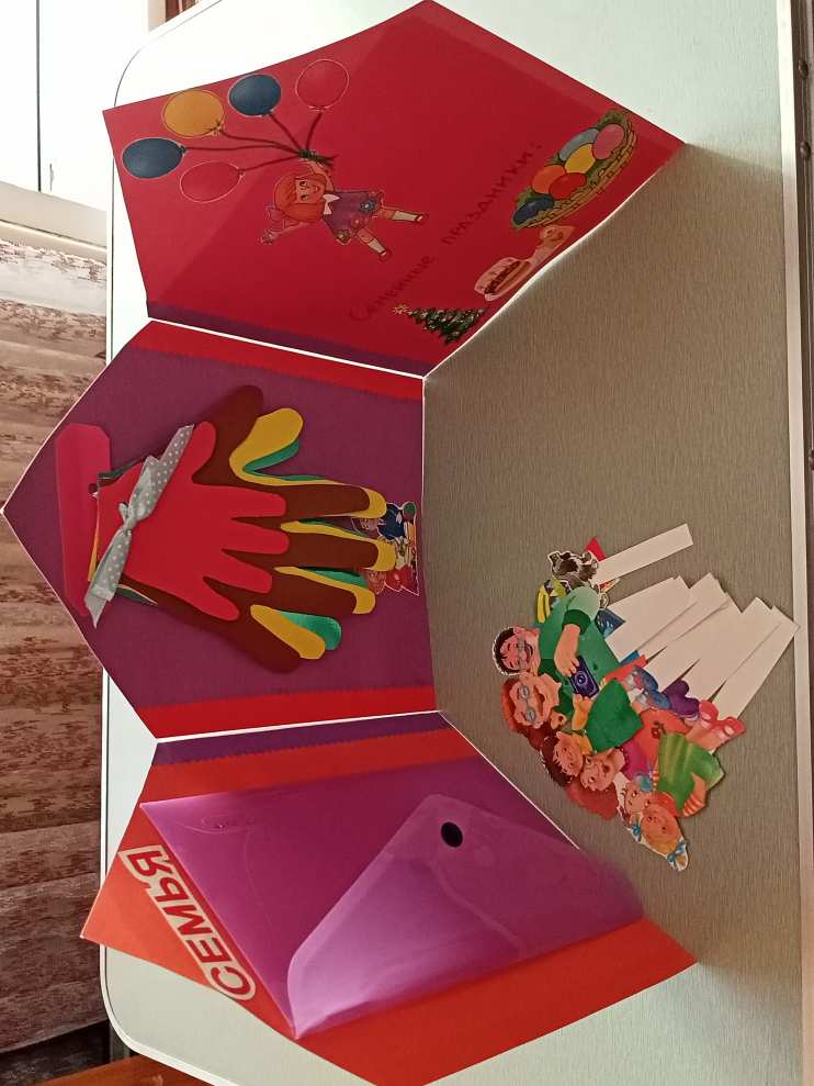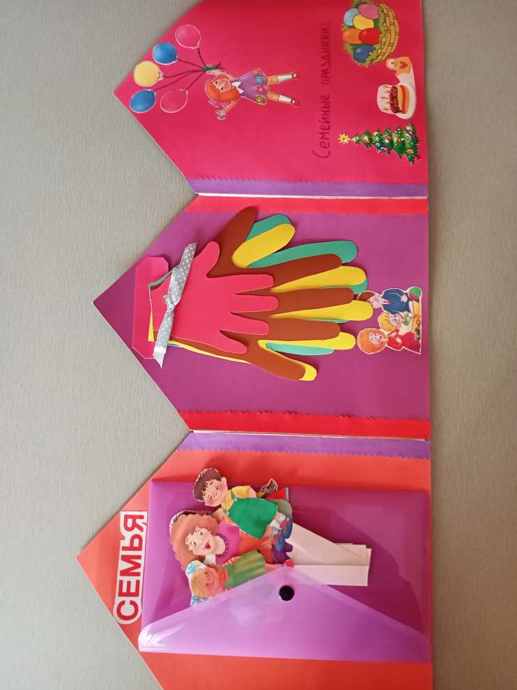 Вторая часть «домика» - это «хранилище». Здесь дети хранят обведенную на картоне «ладошку» каждого члена семьи. «Ладошки» разноцветные. Можно закрепить названия цветов, сравнить ладошки по размеру, придумать игру с «ладошками» (разложить «ладошки» по порядку и т.д.)