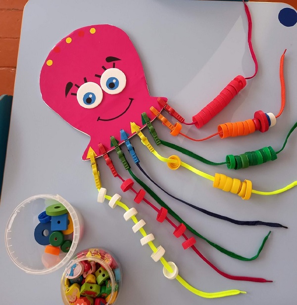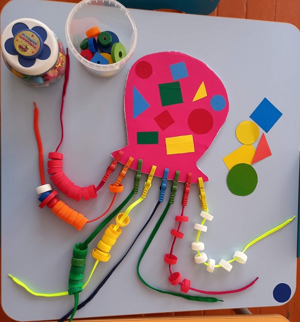 Оборудование: макет осьминога, прищепки, шнурки, пробки разных цветов и размеров; геометрические фигуры разных цветов; шаблоны геометрических фигур.