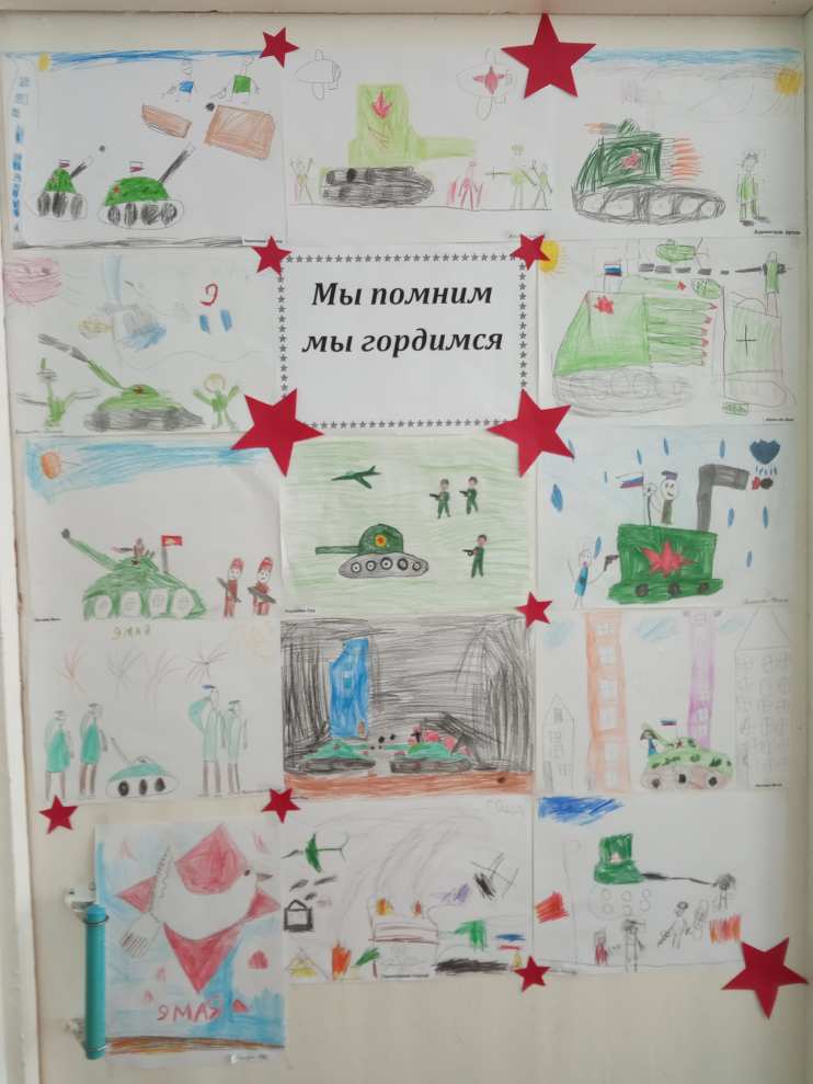 Для любого человека, живущего в России, майский праздник День Победы является одним из самых почитаемых праздников. Нет ни одной семьи в нашей стране, которую не коснулась бы война. В преддверии этого праздника в группе была оформлена тематическая выставка детских рисунков «Мы помним! Мы гордимся!». Дети отразили в рисунках своё отношение к историческим событиям военных лет, к празднику Великой Победы. Рисунки были оценены детьми и родителями.