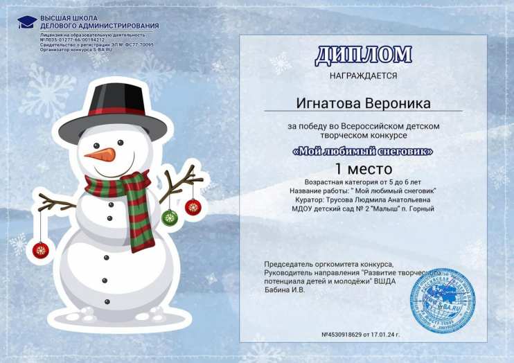 В соответствии с календарным планом воспитательной работы и в рамках празднования 18 января Всемирного дня Снеговика, в МДОУ д/с №2 "Малыш" п.Горный была организована неделя, посвящённая этому празднику. Воспитанники моей группы тоже приняли активное участие в этом мероприятии.