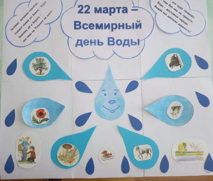 22 марта на всей планете отмечают Всемирный день воды или Всемирный день водных ресурсов. Ежегодно в этот день поднимается новая проблема, связанная с загрязнением водных ресурсов на планете и звучит призыв к её решению. Для того чтобы дети вспоминали о том, как человек использует воду, о важности воды в жизни человека и животных, ведь для некоторых животных вода – это дом, мы изготовили плакат. И вот что у нас получилось.