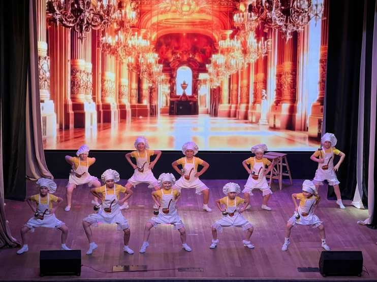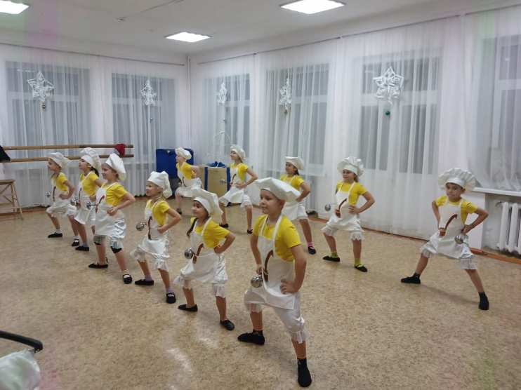 Юные актеры образцового детского коллектива Московской области «Театральной студии «Фантазия» МБУ ДО «Центр «Созвездие» г. Рошаль готовятся впервые выйти на большую сцену. И пусть пока у них небольшой эпизод в новогодней сказке «Щелкунчик», но очень яркий, и студийцы младшей группы стараются достойно выступить вместе со всем коллективом. На фотографии фрагмент сюжета, в котором поварята готовят вместе с королевой торт для принцессы Пирлипат. Событие этой сцены исполняют воспитанники в танце, который поставила хореограф студии Абянова Венера Романовна.
