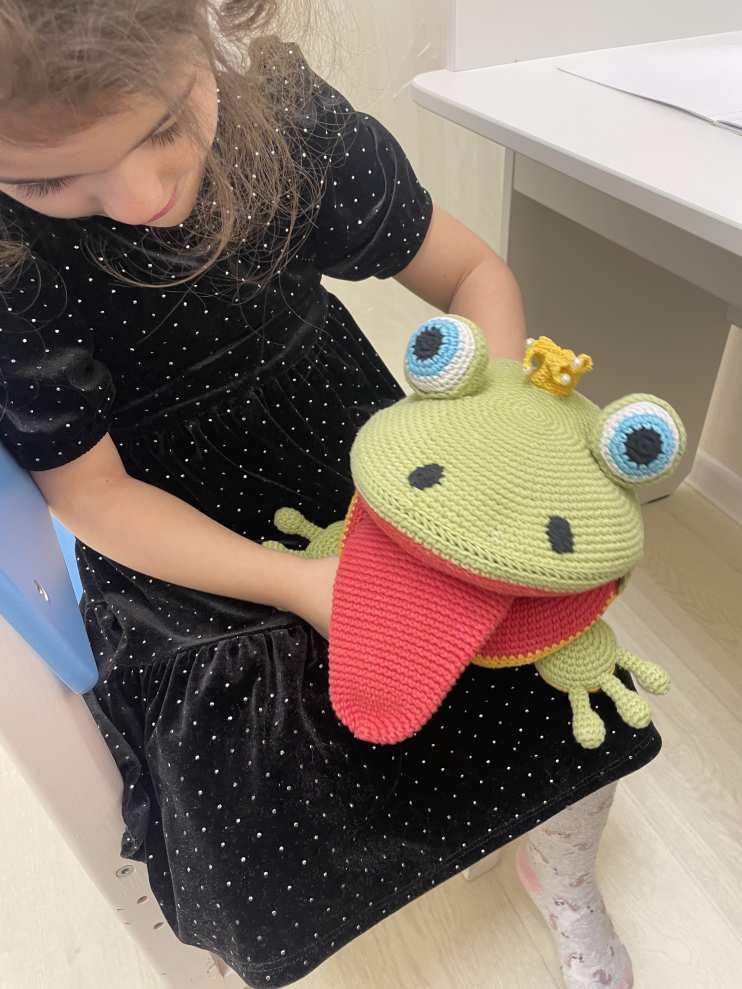 Авторская лягушка-говорушка изготовлена по заказу для кабинета логопеда. На занятиях она активно используется на этапе выполнения артикуляционной гимнастики. Язычок у лягушки отстегивается, а также его можно надевать на руку. С помощью игрушки можно показывать ребенку упражнения для язычка и вместе с ним их выполнять. Детям очень нравится в веселой компании игровых персонажей выполнять логопедические задания, ведь по большей части развитие дошкольников происходит через игровую деятельность.