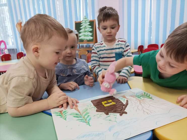 В рамках реализации краткосрочного проекта «Мой дом» с детьми раннего возраста группы № 2 было проведено занятие по лепке на тему «Построим избушку для зайчика». Простые действия раскатывания из пластилина шарика или бревнышка позволяют сформировать конкретные образы, развивают мышление и фантазию. Этот проект даёт возможность воспитывать в детях с раннего возраста заботу, беспокойство и добрые отношения о ком-либо или о чём-либо, нацеленные на его благополучие.