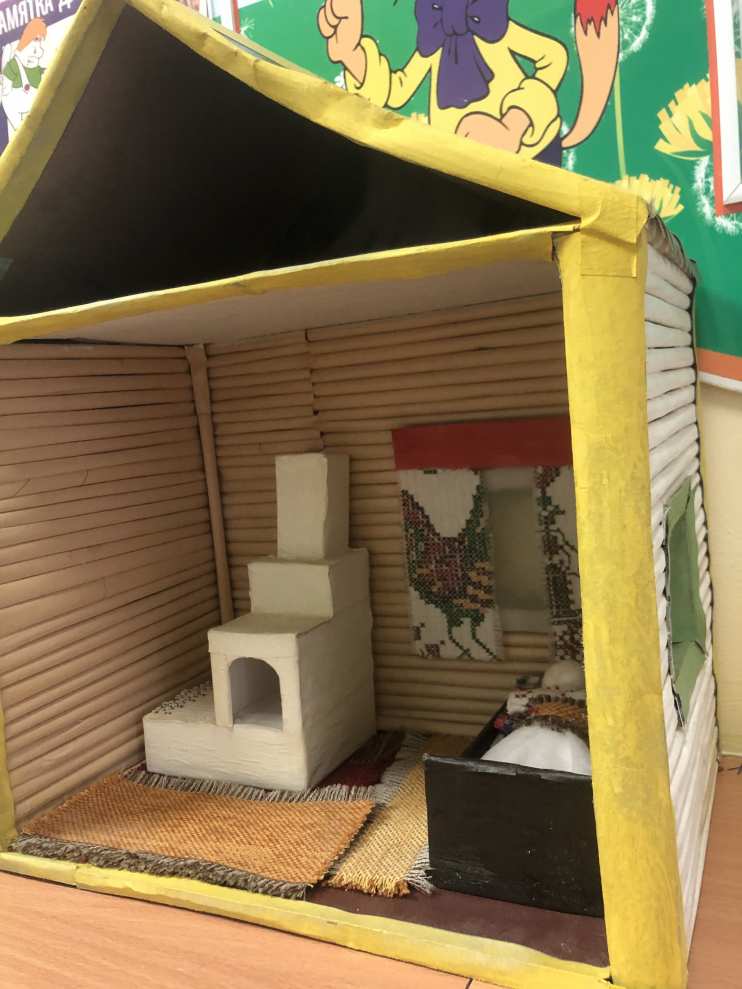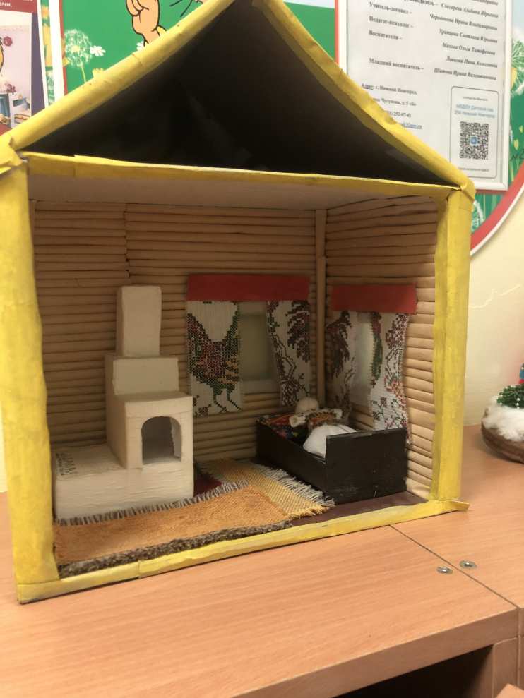Макет представляет из себя комнату, обставленную в русском стиле. Маркеры пространства: лавка, печь, стол, люлька, посуда, сделанная из соленого теста, игрушка-персонаж - кукла-кувадка.