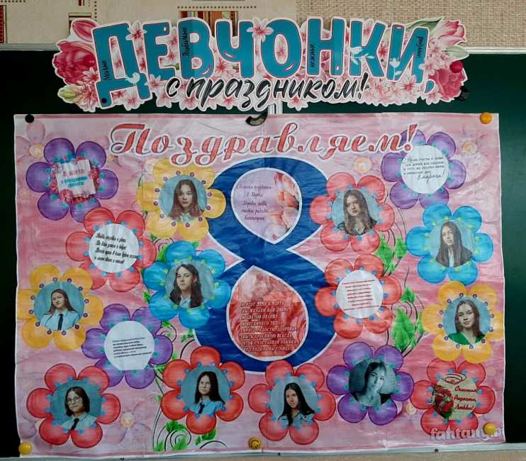 Утром нас ждали приятные сюрпризы от парней — цветы, конфеты и открытки. Весь класс был украшен воздушными шарами, надписями и поздравительными лентами. Это придавало празднику особую атмосферу весенней радости.