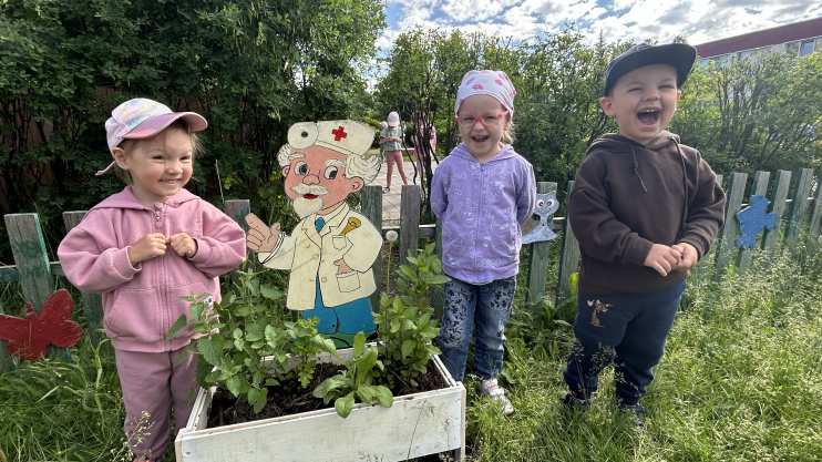 На участке мы с ребятами и с помощью родителей посадили лекарственные растения. А за растениями следит доктор Айболит.