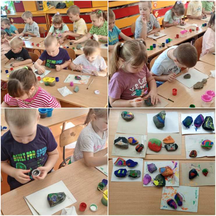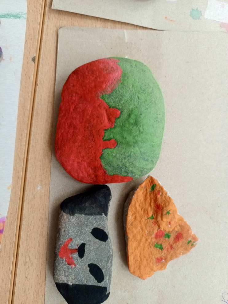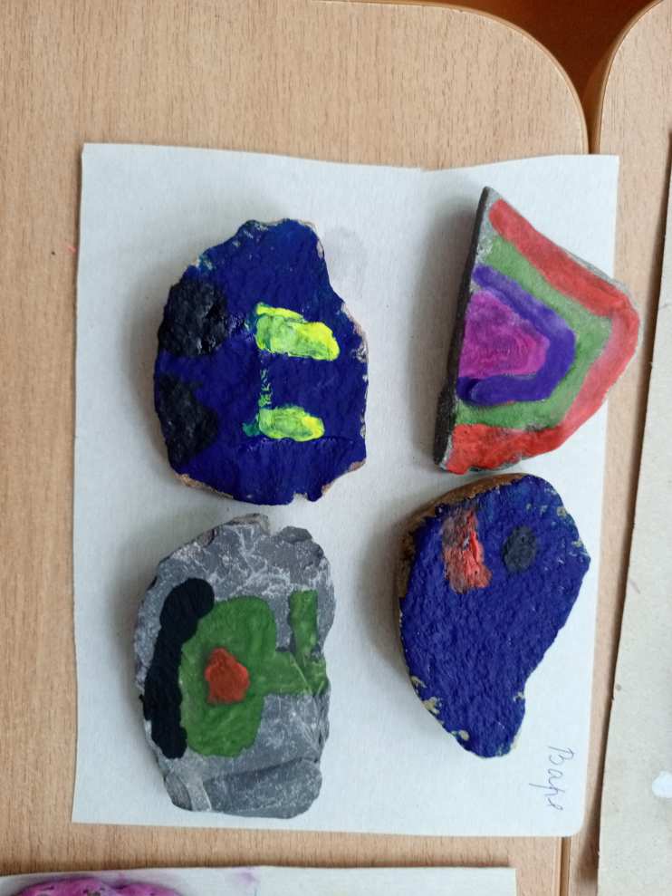 Каждый ребенок во время прогулки нашел свой камушек и принес его в группу. И вот началась творческая работа. Каждый воспитанник очень ответственно подошел к раскрашиванию своего камушка. Дети придумали, как красиво и необычно оформить не привычное для рисования полотно.