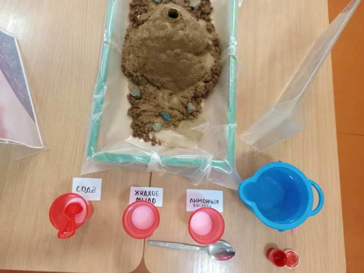 Был создан макет вулкана из песка и бутылки, закопанной в него. Внутрь бутылки засыпали соду. Отдельно в ёмкости развели лимонную кислоту + жидкое мыло + красную гуашь.