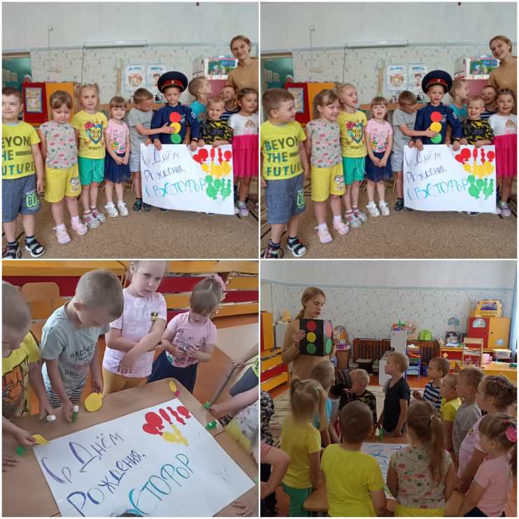 Воспитанники подготовительной группы в этот день подготовили для именинника открытку с красными, жёлтыми и зелёными воздушными шарами. Эту открытку вручили маленькому Светофору и, конечно, исполнили «Каравай».