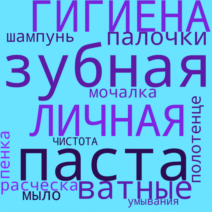 Темы раздела "Личная гигиена" по предмету ОСЖ имеют цикличность, ежегодно расширяют и углубляют знания. При повторении предметов и средств личной гигиены и закрепления умения их различать, после работы с иллюстрациями, предложила ученикам сначала подготовить набор слов по теме. В данном случае облако слов предназначено было для повторения написания трудных слов: расческа, полотенце, гигиена и др.