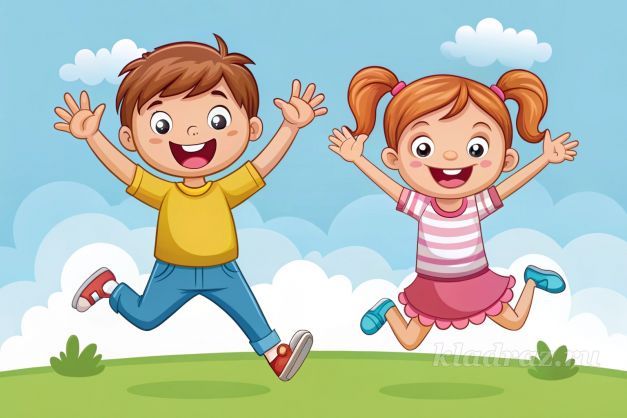 - "Прыжки через веревку" — натяните на высоте около 20-30 см веревку или ленточку и предложите детям перепрыгивать через нее. Постепенно можно повышать уровень сложности, поднимая веревку выше.