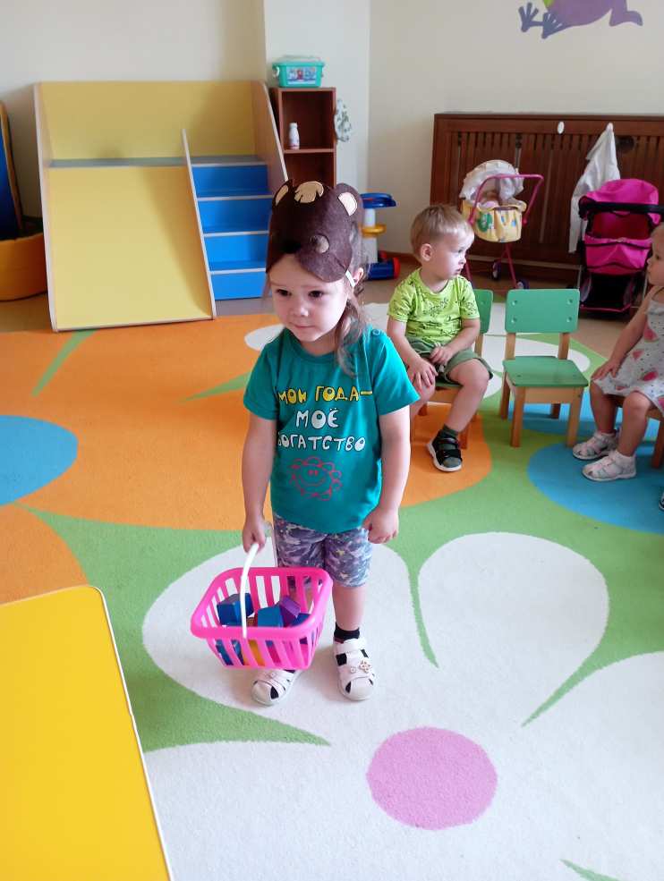 Малыши, надев на голову маску, с трепетом изображали, как мишка танцует, а затем собирает шишки.