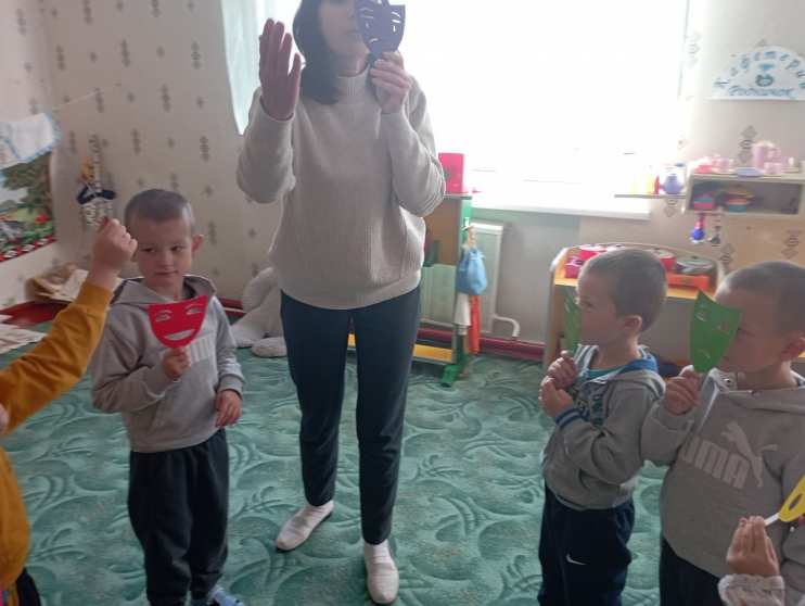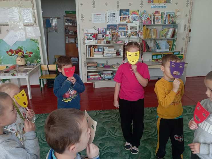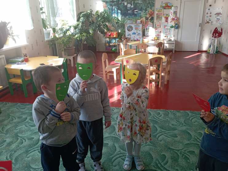 Психолог предлагает каждому ребёнку по очереди подойти и выбрать маску с настроением и сказать, какое у него настроение. Затем обобщает: какое же сегодня у всей группы настроение: грустное, веселое, смешное, злое и т. д.